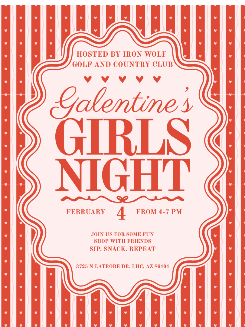 The Iron Wolf Golf and Country Club is hosting our annual “Galentine’s Day” on Wednesday February 4th from 4:00 pm – 7:00 pm. Join us with some friends, shop, sip, repeat. Snag some super cute Valentine's Day gifts or treat yourself. Mix and mingle with Havasu's best gals. Some of your favorite local Havasu vendors are joining us!
