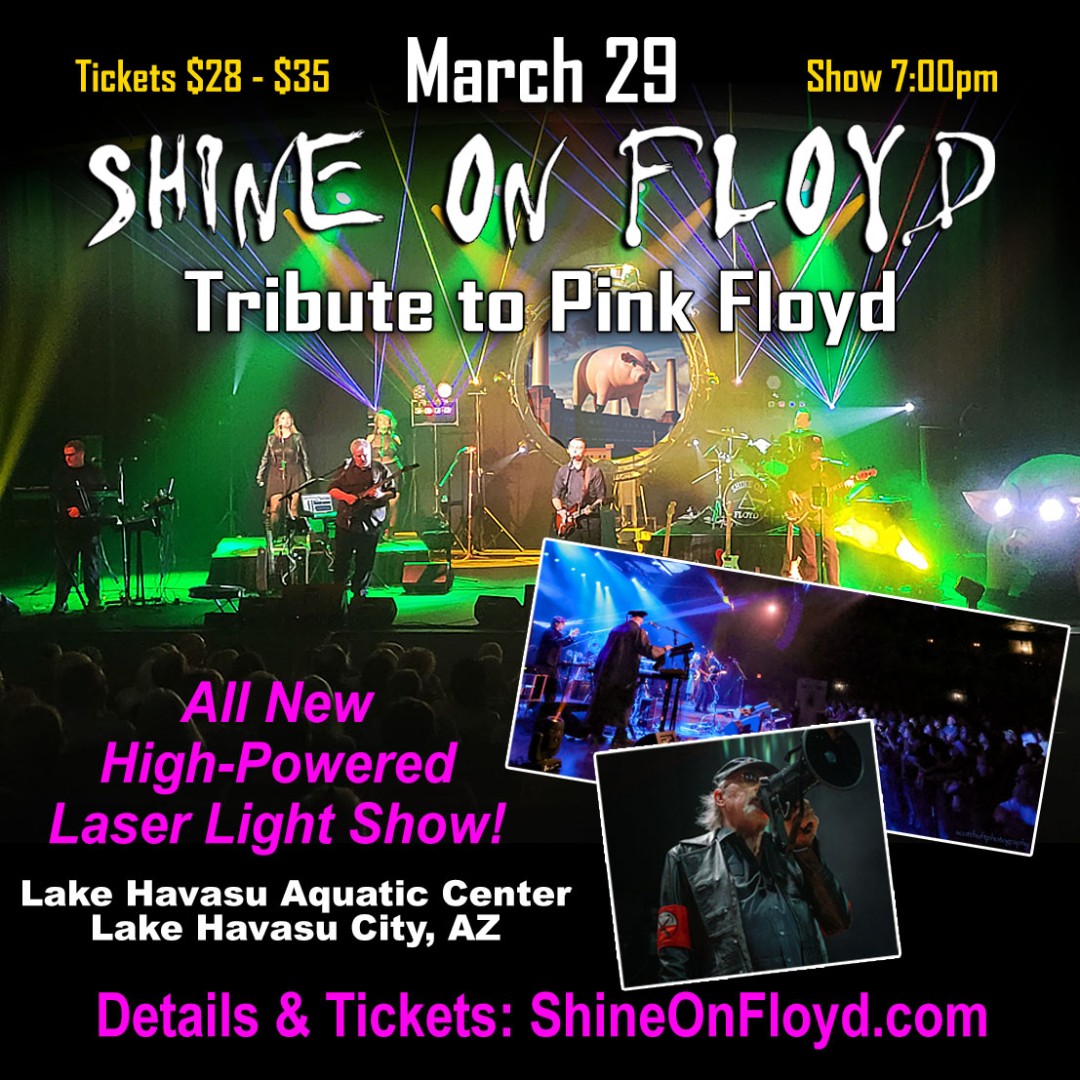 Shine On Floyd pays tribute to Pink Floyd at the Lake Havasu Aquatic Center on March 29. Hear all the great Pink Floyd songs along with our full stage show including an all new high-powered laser light show. Take a trip back in time and remember when you were young. Good seats still available. Tickets at: https://app.fangenie.com/lake-havasu-aquatic-center/shine-on-floyd/mWtnMiWimn